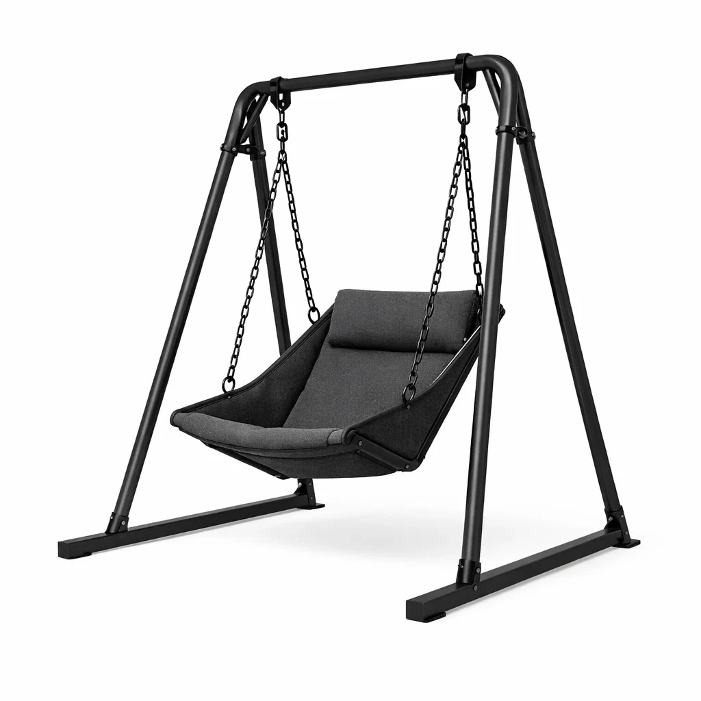Materiale: struttura in acciaio verniciato a polvere, seduta in tessuto poliestere, catene in metallo zincato.